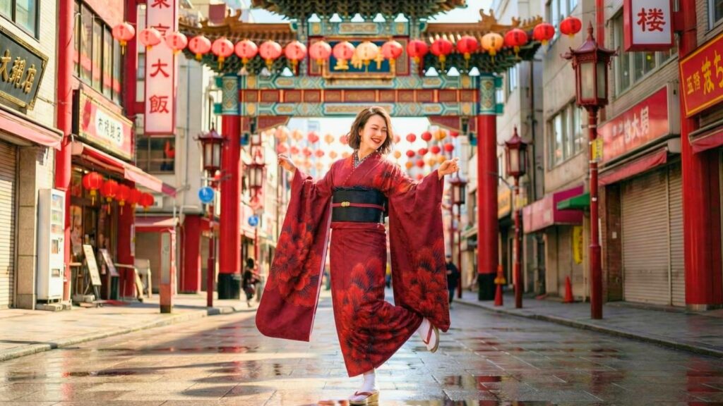 이국적인 정취가 넘치는 거리. 기모노와 차이나타운의 화려한 분위기가 만드는 신선한 대비.